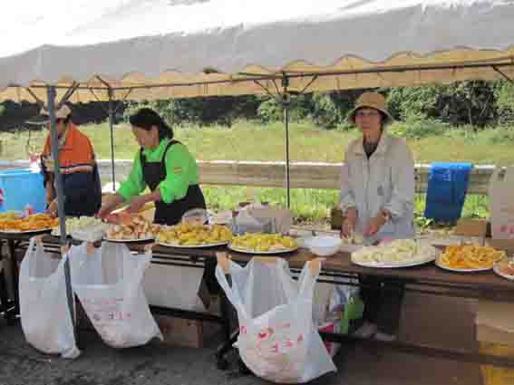 二番目のエイドの十二峠バス停前です エイドにはおにぎり、ドリンク、バナナ、レモン、梅干、氷砂糖、塩が必ず置いてあるのはありがたいです。私は氷砂糖を口に含んで走ります