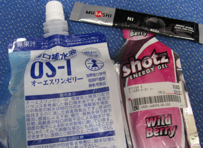 レース中の補水、補給としてはエイドステーションでは必ず固形物と水分補給し、足りない部分に関してはカーボショッツ OS1 MUSASHIを適宜摂るようにすればなんとかなるかもしれない