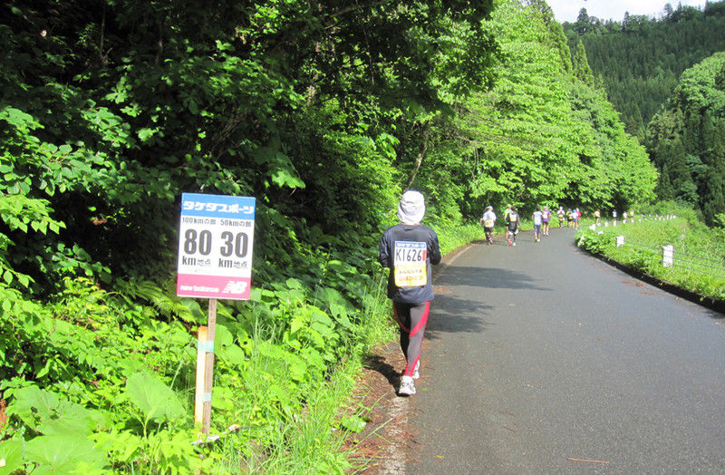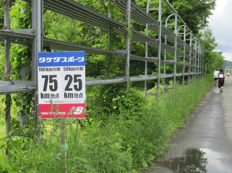 ここから80キロ地点までは単調なコースとなるのでかなりしんどく、ペースも遅いのでかなりのランナーに追い越されました。今回の大会は雨の中はしることになったのですが、ゼッケンの紙質が変わったせいか濡れて破れ落ちたゼッケンがかなりありました。また80キロと85キロのキロ表示がいつもと場所がかなり違っていて、昨年までのほうが位置的に合っているのではないかと思います。