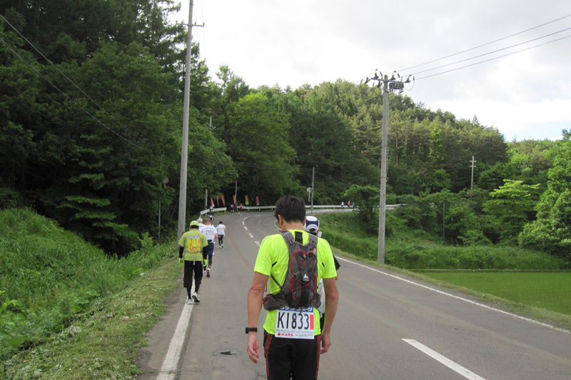 秋田自動車道の高架下を過ぎると21.2キロの県道合流地点手前エイドに到着、2時間20分経ちました。相変わらず脚は重いのですが、それよりも足指に違和感があり気になり始めました。シューズはサロマレーサーST2で萩往還で使用し問題無かったのですが、雨に濡れたせいかアッパー部分が少し縮んでしまったようです。特に左足の小指が痛かったのですが、走るには支障無いのでこのまま様子みながら走ることにしました。